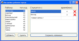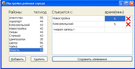 во втором указаны стыкуюшиеся районы с выделенным в первом окне и время пути вминутах для подсчета предварительной суммы.