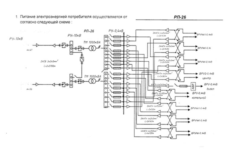 Электроэнергия осуществляется от РП-26 по кабельным линиям во ВРУ-0,4 кВ.