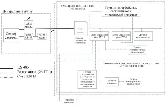 Система освещения здания формируется как сумма систем освещения помещений с передачей ряда функций управления общему серверу здания, имеющему, как правило, более высокий приоритет и используемому в качестве регулятора режимов управления и диспетчерским центром (сбор и хранение данных, составление и отображение отчетов) [14-16].