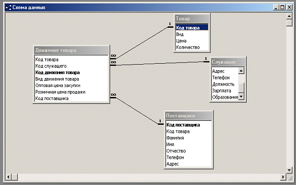 добавления в схему всех нужных таблиц, Access образует связи
