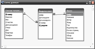 Моя база данных состоит из главной таблицы «Книги» и связанных с ней таблиц : Выдача книг и Список читателей.