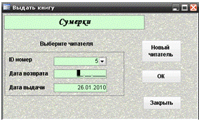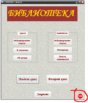 Возврат книг. Кнопка «Выдача книг» предназначена для регистрации выданных книг.