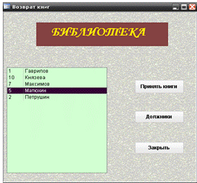 Из списка необходимо выбрать фамилию читателя, который вернул книгу, и нажать на кнопку «Принять книги», откроется форма со списком книг, которые находятся на руках у выбранного читателя. Из списка выбираем книгу, которую надо вернуть, и нажимаем на кнопку «Принять».