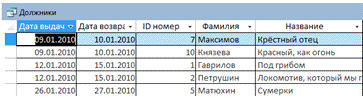[Выдача книг].[Дата выдачи], [Выдача книг].[Дата возврата], [Список