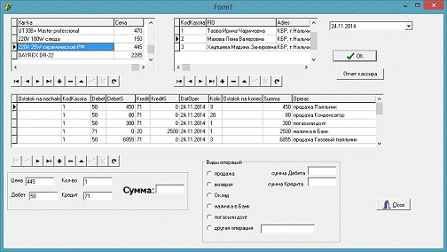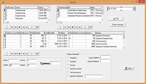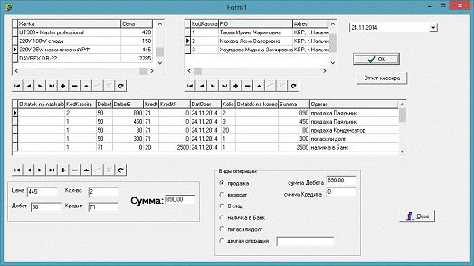 После запуска программы мы из базы данных Kassir.db выбираем кассира, выбираем из БД Tovar любой товар, при этом цена автоматически заполняет компонент Edit: