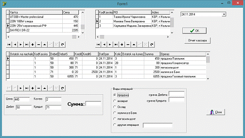 // stoim, naz,nar:string;.GurOper1.Insert;.GurOper1.FieldByName('Debet').AsString:= Edit3.Text;.GurOper1.FieldByName('Kredit').AsString:= Edit4.Text;.GurOper1.FieldByName('DatOper').AsString:=DateToStr(DateTimePicker1.Date);.GurOper1.FieldByName('KodKassira').AsString:=Ligidov.Kassir.FieldByName('KodKassira').AsString;.GurOper1.FieldByName('Kolic').AsString:=Edit2.Text;:=CalKuljator(Edit1.Text,Edit2.Text,'*',2);:=ZnakZamena(a0,'.',',');.GurOper1.FieldByName('summa').AsString:=a0;.Text:=a0;radiobutton1.Checked then.Text:=a0;.Text:=inttostr(0);:='продажа ';:=a1+Ligidov.Tovar.FieldByName('Tovar').AsString;.GurOper1.FieldByName('Operac').AsString:=a2;;radiobutton2.Checked then.Text:=inttostr(0);.Text:=a0;:='возврат ';:=a1+Ligidov.Tovar.FieldByName('Tovar').AsString;.GurOper1.FieldByName('Operac').AsString:=a2;;radiobutton3.Checked then:=edit6.text;.GurOper1.FieldByName('Operac').AsString:=a2;;radiobutton4.Checked then.Text:=inttostr(0);.Text:=a0;:='Оклад';:=a1+Ligidov.Kassir.FieldByName('FIO').AsString;.GurOper1.FieldByName('Operac').AsString:=a2;;radiobutton5.Checked then.Text:=inttostr(0);.Text:=a0;