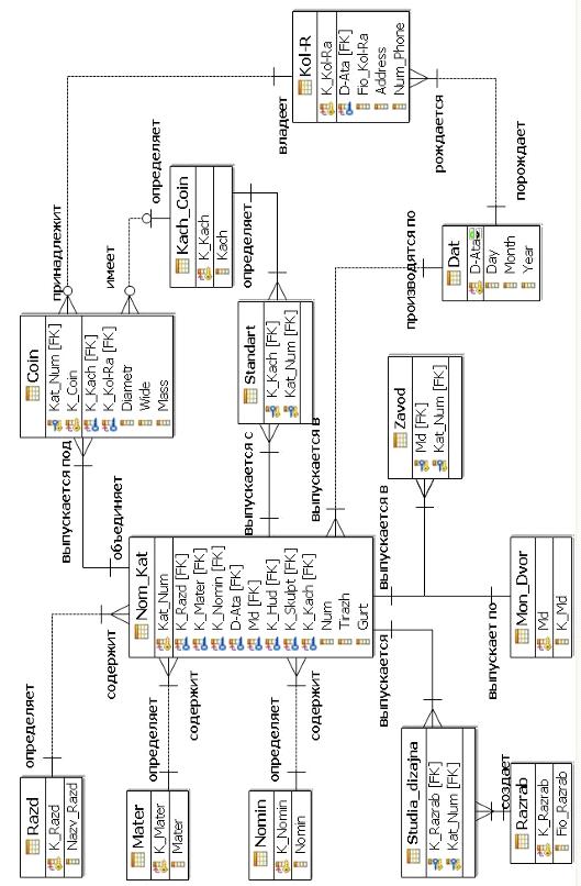 ALTER TABLE Nom_Kat ADD CONSTRAINT Nom_Kat_Pk PRIMARY KEY (Kat_Num);TABLE Coin ADD CONSTRAINT Coin_Pk PRIMARY KEY (Kat_Num, K_Coin);TABLE Kol-R ADD CONSTRAINT Kol-R_Pk PRIMARY KEY (K_Kol-Ra);TABLE Razd ADD CONSTRAINT Razd_Pk PRIMARY KEY (K_Razd);TABLE Mater ADD CONSTRAINT Mater_Pk PRIMARY KEY (K_Mater);TABLE Nomin ADD CONSTRAINT Nomin_Pk PRIMARY KEY (K_Nomin);TABLE Dat ADD CONSTRAINT Dat_Pk PRIMARY KEY (D-Ata);TABLE Mon_Dvor ADD CONSTRAINT Mon_Dvor_Pk PRIMARY KEY (Md);TABLE Razrab ADD CONSTRAINT Razrab_Pk PRIMARY KEY (K_Razrab);TABLE Kach_Coin ADD CONSTRAINT Kach_Coin_Pk PRIMARY KEY (K_Kach);TABLE Standart ADD CONSTRAINT Kach_Coin_X_Nom_Kat_Pk PRIMARY KEY (K_Kach, Kat_Num);TABLE Zavod ADD CONSTRAINT Mon_Dvor_X_Nom_Kat_Pk PRIMARY KEY (Md, Kat_Num);TABLE Studia_dizajna ADD CONSTRAINT Razrab_X_Nom_Kat_Pk PRIMARY KEY (K_Razrab, Kat_Num);TABLE Nom_Kat ADD CONSTRAINT Nom_Kat_Razd_Fk FOREIGN KEY (K_Razd)