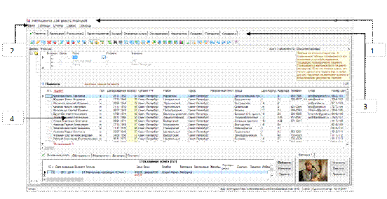- Строка названия; 2 - Панель меню; 3 - Панель вкладок; 4 - Таблица базы данных