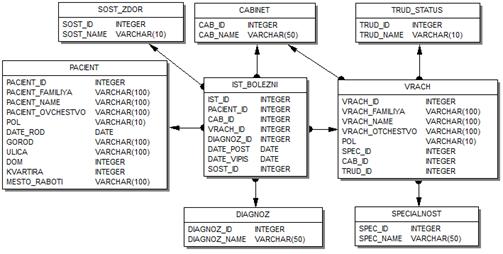 PACIENT_ID VRACH_ID DIAGNOZ_ID CABINET_ID SPECIALNOST_ID SOST_ID TRUD_ID IST_ID |