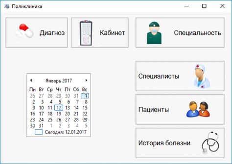 Главное окно приложения представляет собой своего рода механизм управления, с помощью которого можно получить доступ к информации, хранящейся в базе данных поликлиники. Данная форма представляет собой набор клавиш, которые переключают пользователя на необходимые ему данные.