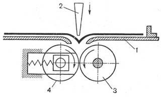 Ножевой способ фальцовки (рис. 1.15) получается при проталкивании листа, выровненного по передним и боковым упорах, подвижным ножом 2 между двумя, вращающихся навстречу друг другу, валиками 3 и 4, которые обжимают место сгиба - фальц. Зазор между валиками регулируется по толщине фальцуемой тетради.