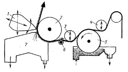 3, 4 - вертикальные валики; 5 - купающийся валик; 6 - роль-ракель; 7 -