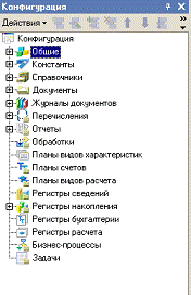 Кроме того, когда окно дерева конфигурации активно в меню Действия становятся доступными пункты "Глобальный модуль", "Общие таблицы" и "Библиотека картинок".