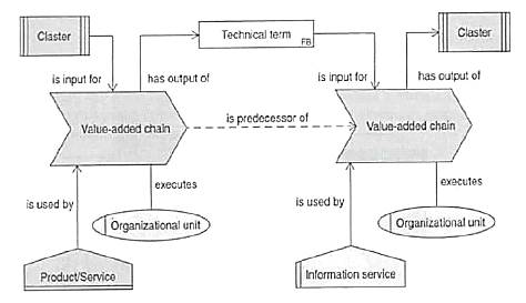 Объекты соединяются между собой при помощи связей определенного типа (см. рис.). Например, информационный поток, отображаемый объектом Сlustеr, является входящим для первого процесса и связан с ним при помощи стрелки типа is inрut fоr («является входом для»). Другой пример - тип связи ехесutеs («исполняет») между объектами Vаluе-аddеd сhаin и Оrgаnizаtiоnаl unit. Тип связи is usеd bу показывает, что Рrоduсt/Sеrviсе используется процессом и т.д. Таким образом, в методологии АRIS важнейшим требованием является корректный выбор и дальнейшее использование связей и объектов определенного типа.