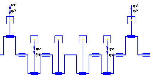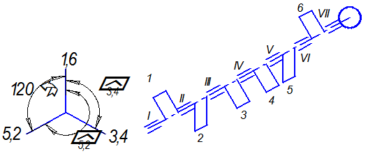 На данной схеме изображен коленчатый вал двигателя, в котором уравновешены силы инерции 1 и 2 порядков, центробежные силы инерции, а также моменты этих сил.