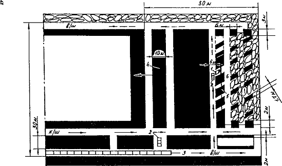 конвейер; 4 - барьерный целик; 5 - междукамерный целик; 6 - камера