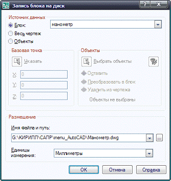 сохранения блока, единицей измерения задаем миллиметры, источником данных