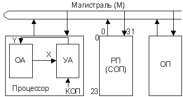 ЭВМ состоит из процессора, основной (оперативной) памяти (ОП), регистровой (сверхоперативной) памяти (РП) и средств ввода-вывода информации. Структурная схема ЭВМ показана на рисунке 1.1.