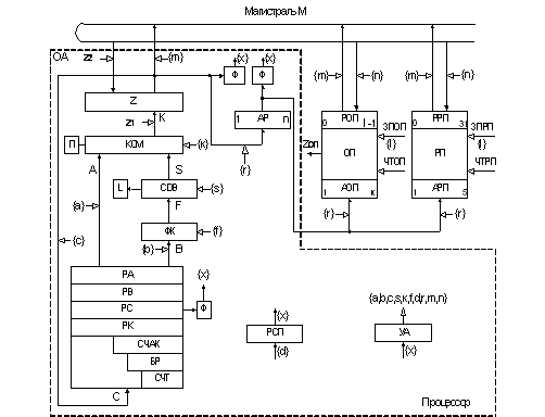 Результат МО фиксируется в промежуточном регистре Z управляющим сигналом z1 на время одного такта, а затем может быть передан в память ОА по шине С (управляющие сигналы {c}), в ОП или РП через магистраль М (управляющие сигналы {m}) или в адресный регистр АР (управляющие сигналы {r}).