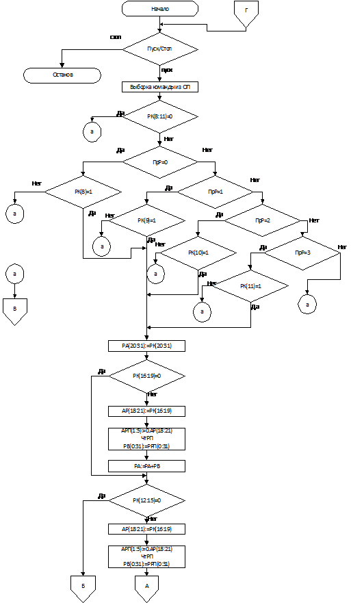 ОА строится на основе принципа общих микроопераций. ОП разделяется на 2 части: память ОА и комбинационную часть (рисунок 1.1). Память ОА состоит из N регистров. Рабочие регистры РА, РВ, РС и т.д. используются для хранения операндов и внутренних слов МП. Длина их определяется длиной операндов и особенностью выполнения команд. Длина регистра команд РК назначается из максимального формата команд заданного набора. Счетчик адреса команд (СчАК) хранит и модифицирует адрес команды. Длина СчАК определяется емкостью ОП в полусловах, т.е: