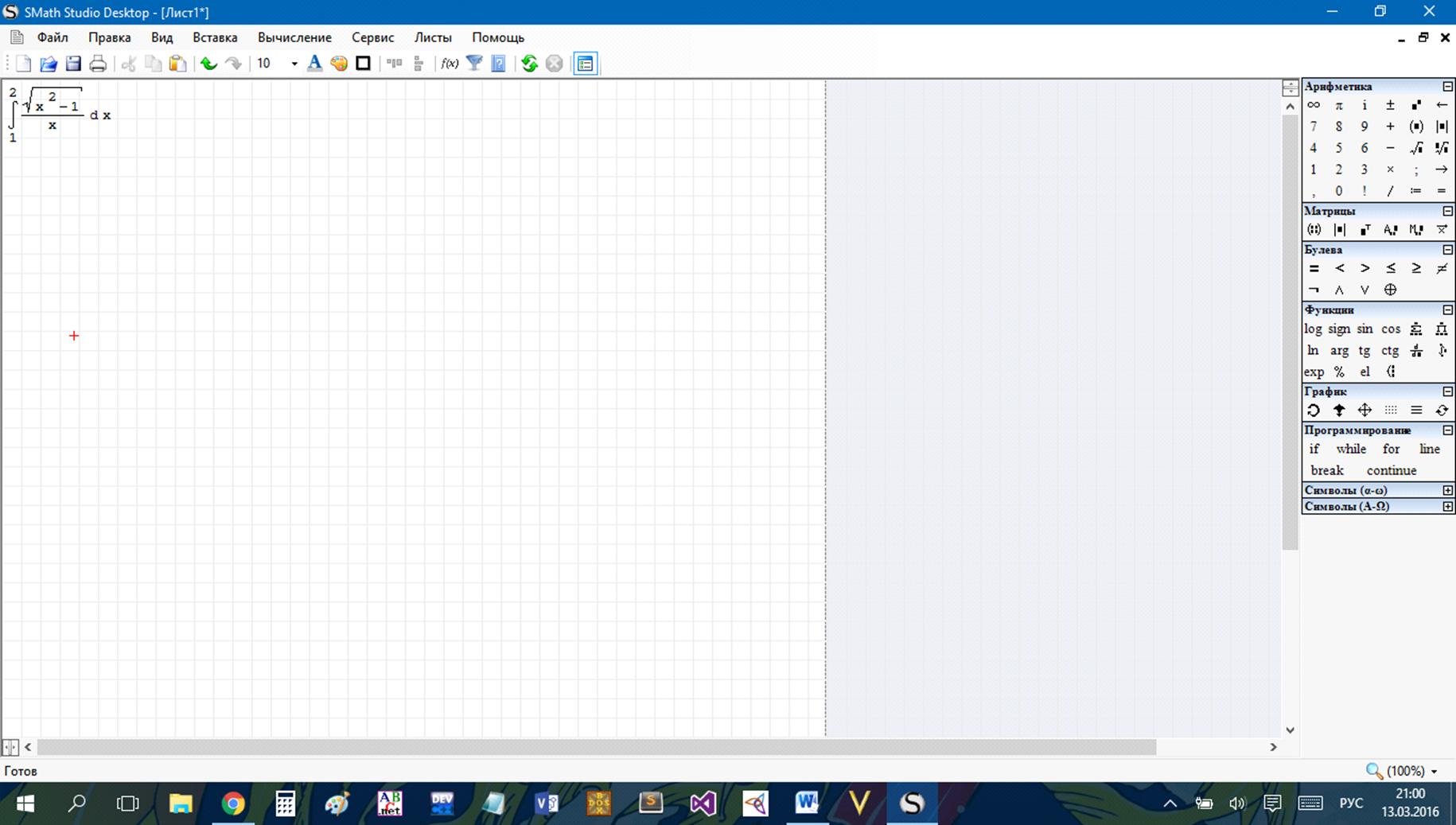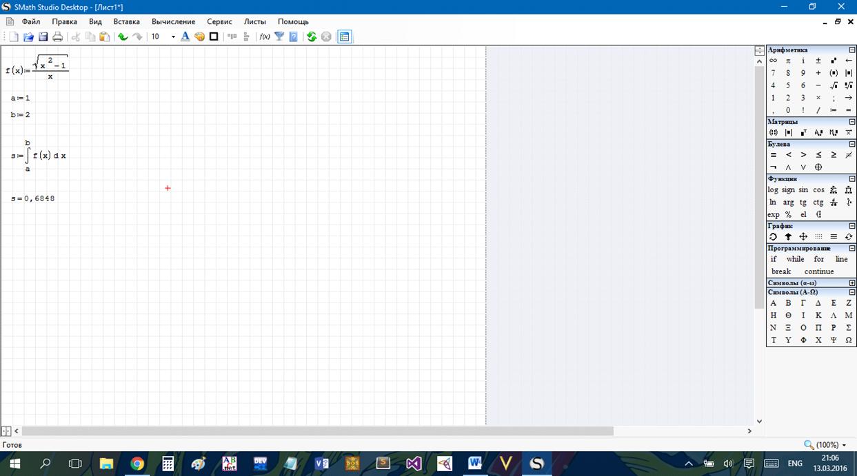 SMáth Stúdio - бесплатная программа для вычисления математических выражений и построения графиков функций. Работа с интерфейсом программы напоминает работу с обычным листом бумаги, так как все математические выражения в ней записываются не в строчку текстом, а в графическом, удобном для человека, виде.