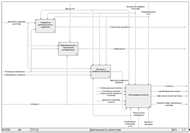 Диаграмма А0- отражает основную деятельность нашего агентства, которая представлена в виде четырех процессов: "Управление деятельность и развитием", "Информационная и техническая составляющие", "Обучение и развитие персонала" и "Обслуживание клиента".