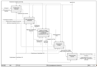 · Диаграммы А4.1 "Привлечение клиентов" (рисунок 7), А4.2 "Сбор требований и пожеланий" (рисунок 8), А4.3 "Выбор из готовых туристических путевок / Составление индивидуальной туристический путевки" (рисунок 9), А4.4 "Оформление путевки" (рисунок 11);