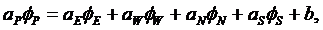 Значения обобщенной зависимой переменной φ сохраняются в расчетных точках. Дискретное уравнение связывает значение φ в одной расчетной точке со значениями ее в четырех соседних точках. Такое уравнение получается при интегрировании уравнения по контрольному объему, содержащему точку (i, j).