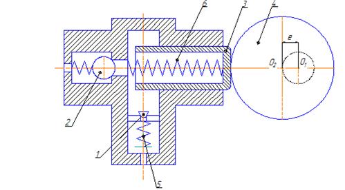 Заполнение насоса жидкостью происходит через всасывающий клапан 1, а вытеснение из цилиндра (нагнетание)- через нагнетательный клапан 2. Привод поршня осуществляется эксцентричным кулачком (диском) 4, к которому поршень 3 поджимается пружиной или иными средствами. Ось О1 вокруг которой вращается кулачок, смещена относительно его геометрической оси О2 на величину эксцентриситета е, в соответствии с чем геометрическая ось (центр) О2 кулачка описывает при его вращении вокруг оси О1 окружность радиусом, равным эксцентриситетом е. Поршень 3 при этом будет совершать в цилиндре возвратно-поступательные движения на величину пути 2е. При вращении эксцентрикового кулачка 4 вокруг оси О1 приводного вала, с которым этот кулачок жестко соединен, геометрическая ось (центр) О2 кулачка будет описывать окружность радиусом r=е вокруг оси вала О1. При этом поршень 3 насоса, прижимаемый к эксцентрику пружиной 6 (или иными средствами), будет перемещаться возвратно-поступательно в цилиндре, совершая за один оборот два хода, каждый из них равен h=2е. При движении поршня 3 в левую сторону (соответствуют для данного направления вращения верхней половине эксцентрика) объем цилиндровой камеры уменьшается и жидкость, заполняющая ее, вытесняется через клапан 2 в нагнетательную полость. При обратном движении поршня (соответствует нижней половине окружности эксцентрика) объем цилиндровой камеры будет увеличиваться и жидкость преодолев усилие пружины 5 и открыв всасывающий клапан 1, будет поступать в камеру насоса.