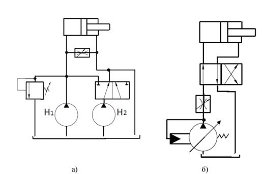 а) с двумя нерегулируемыми насосами; б) с насосом, автоматически управляемым по давлению
