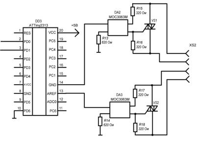 В модуле управления нагрузками применен микроконтрллер ATTiny2313 для управления нагрузками в автономном режиме. Данный микроконтроллер относительно недорогой. Широко распространен.