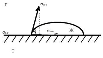 Краевой угол q измеряется в сторону более полярной фазы (в данном случае в сторону воды). Обозначение sТ-Г показывает поверхностное натяжение между твердым телом и газовой фазой, sТ-Ж показывает поверхностное натяжение между твердым телом и жидкой фазой, а sЖ-Г показывает поверхностное натяжение между жидкой и газовой фазой [14].