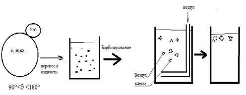 Вследствие гидрофобности поверхности клетки «прилипают» к пузырькам воздуха и