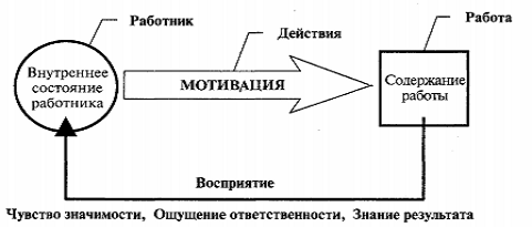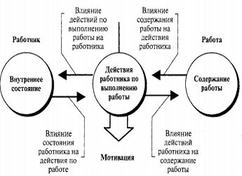 Приведенная выше модель объясняет механизм взаимодействия - взаимного воздействия содержания работы и внутреннего состояния работника, вызванного работой, на мотивацию, а также воздействие работника своими действиями на содержание работы и на собственное внутреннее состояние, которые, в свою очередь, сами непосредственно оказывают воздействие на характер действий и мотивацию работника.