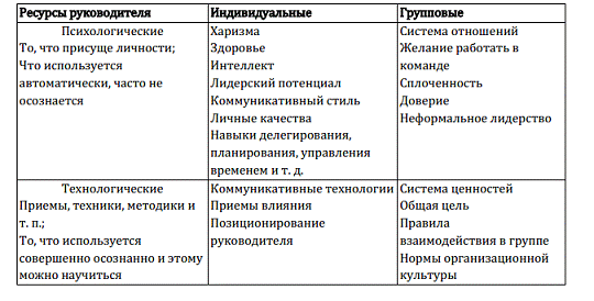 Руководитель в своей управленческой деятельности опирается на собственные ресурсы - психологические особенности личности, харизму, присущий ему стиль взаимодействия с подчиненными , а также свой личный опыт и отработанные методики и приемы.