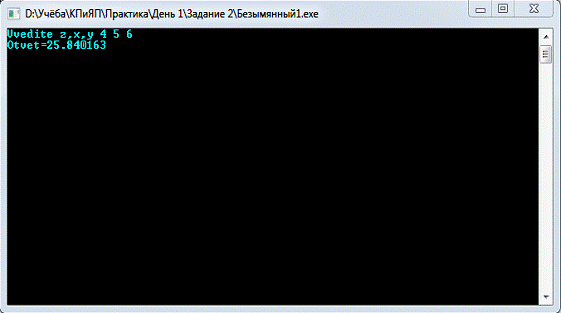{x,z,y; double b;("Vvedite z,x,y ");("%d" "%d" "%d",&z,&x,&y);=exp(x-y)*pow((pow(tan(z),2)+1),x);("Otvet=%lf",b);();