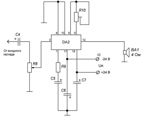 Выходной каскад, как правило, выполняется на мощной специализированной микросхеме, которая должна обеспечить заданную выходную мощность в нагрузке.