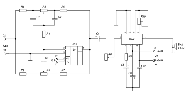 потенциометром R2. Максимальная глубина регулировки на нижних частотах