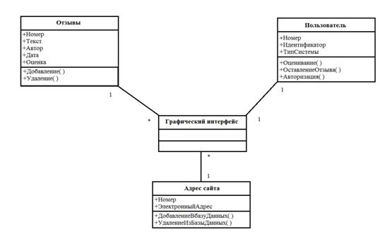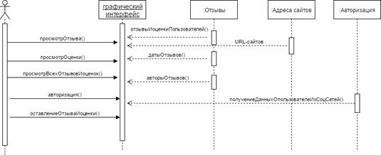 Графический интерфейс в свою очередь отвечает на запросы пользователя, путем получения ответных сообщений от объектов: «Отзывы», «Адреса сайтов», «Авторизация».