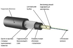 Оптоволоконный кабель [2] - это кабель, состоящий из гибких стеклянных волокон, по которым распространяются световые сигналы. Считается, что данный тип кабеля наиболее качественный и обеспечивает очень высокую передачу данных, а также лучше, чем остальные кабели обеспечивает защиту от помех.