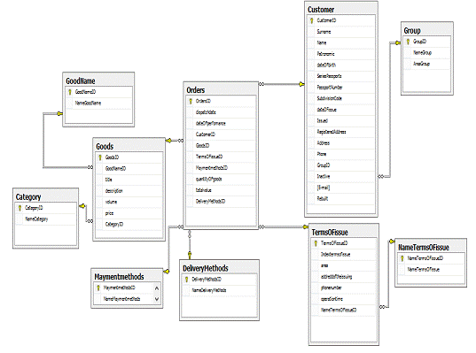 заказов, способов оплаты, способах доставки. БД строилась в среде Microsoft SQL