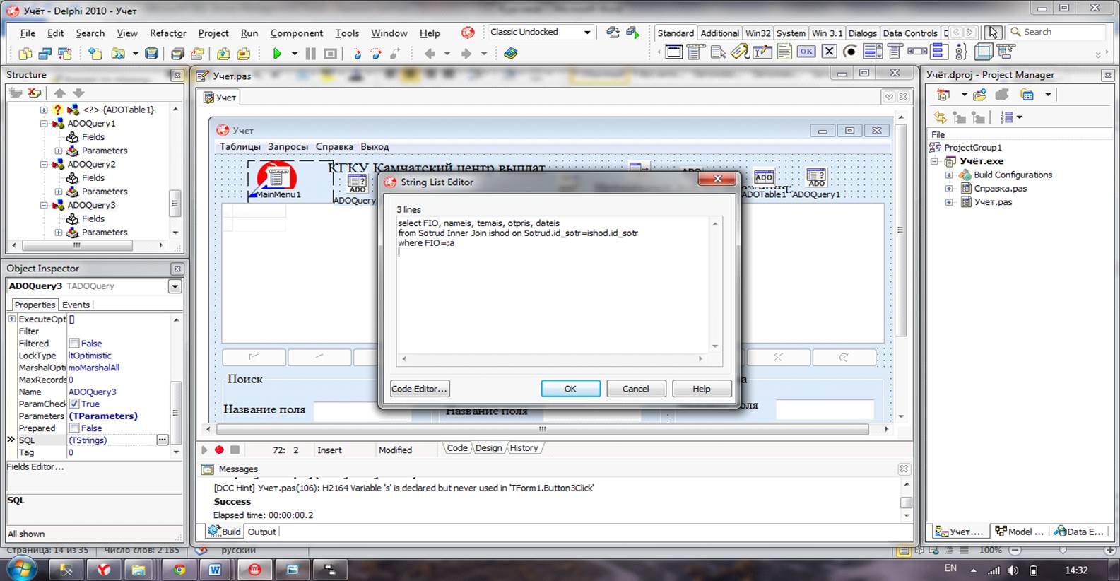 Для разработки приложения используются компоненты ADOConnection, ADOTable, ADOStoredProc и DataSource.