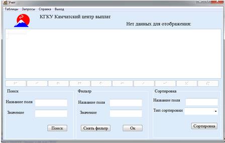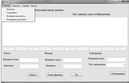 Главное меню, поле для просмотра таблиц, поля для выполнения поиска,