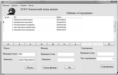 сортировки и фильтрации, так же навигатор для удобства пользования таблицами.