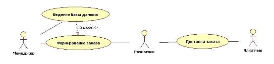Менеджер фирмы принимает заказы, на складе формируют заказы, разносчик доставляет заказы клиентам.