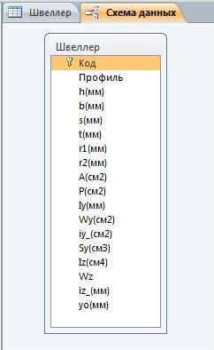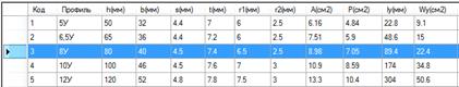 Она хранит информацию, которая содержит следующие данные: Код, Профиль, h(мм), b(мм), s(мм), t(мм), r1(мм), r2(мм), A(см2), P(кг/м), ly(см4), Wy(см3), iy(мм), Sy(см3), lz(см4), Wz(см3), iz(мм), y0(мм).