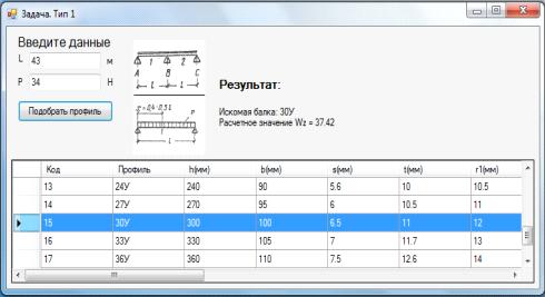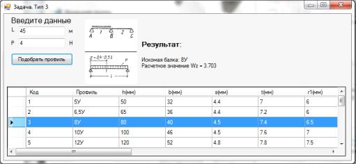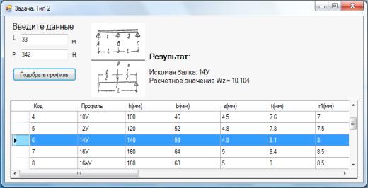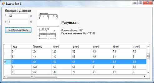 Отталкиваясь от рассчитанного значения W - требуемого момента сопротивления, программа подсвечивает
