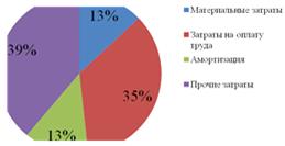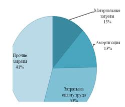 Затраты на реализацию услуг в 2013 году составили 29161 тыс. руб. Из них материальные затраты составляют 13% (3509 тыс. руб.), оплата труда 33% (8779 тыс. руб.), амортизация 13% (3674 тыс. руб.) и прочие затраты 41% (13199 тыс. руб.) (рисунок 2.4).