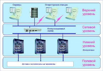На нижнем уровне контроллеры АСУ ТП выполняют измерение параметров технологического процесса и управляют его протеканием. Передают, через коммуникационный сервер сетевого уровня, информацию на верхний уровень.