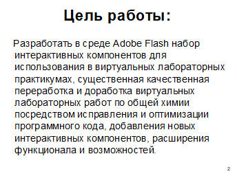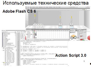 Виртуальный лабораторный практикум по дисциплине «Общая химия» разработан посредством мультимедийной платформы Adobe Flash CS 6 с использованием объектно-ориентированного языка программирования Action Script 3.0.
